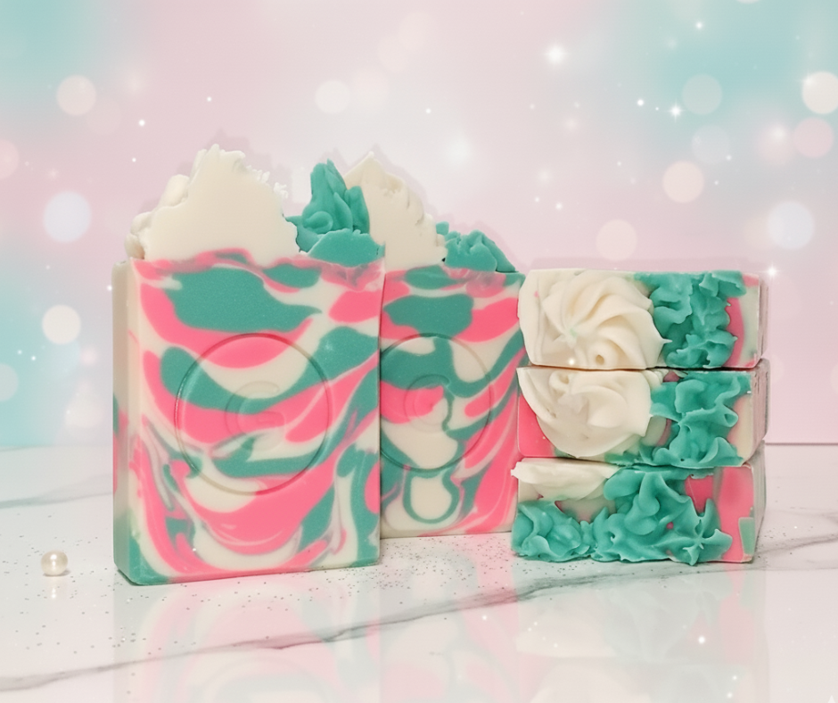 ⭐ Ingredientes: Aceite de Girasol, Aceite de Oliva, Aceite de Coco, Manteca de Karité, Agua Destilada, Hidróxido de Sodio, Manteca de Cacao, Aceite de Ricino, Aceite de Salvado de Arroz, Fragancia, Azúcar, Lactato de Sodio, Arcilla Kaolín, Leche de Coco y Mica.